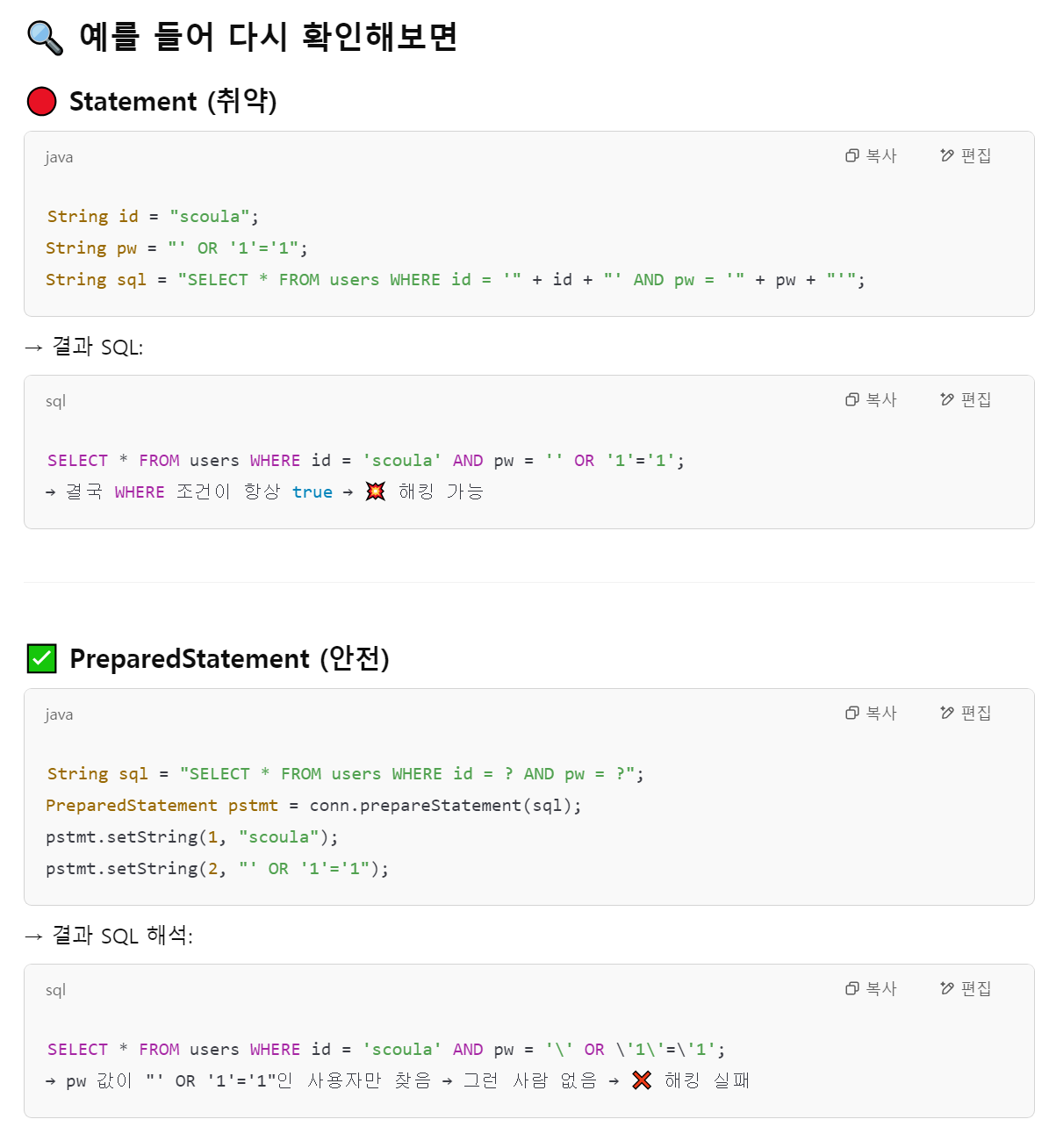 2. pstmt는 DBMS 쪽에서 SQL 구조를 미리 컴파일 해놓고 데이터만 바인딩 하는 형식이라 시간 효율적