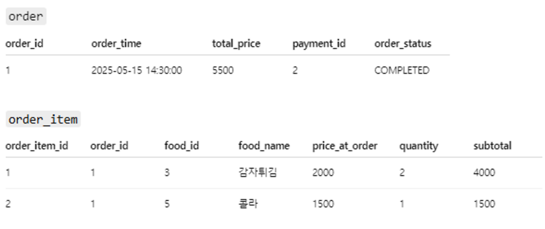 주문 내역 아이디,주문시 금액, 주문 시 음식 이름, 주문 금액 합, 개수, 음식 id(어느 음식이랑 연관된 주문인가?), 주문 id (몇 번 주문에 속하냐?) 필드를 가집니다
